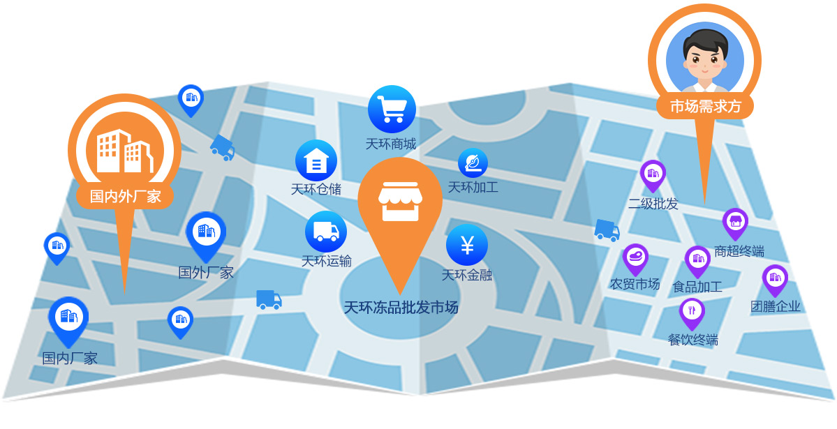 天環(huán)商城是依托于線下實(shí)體批發(fā)市場而搭建的一個專注在冷凍食品供應(yīng)鏈的B2B電商平臺。
